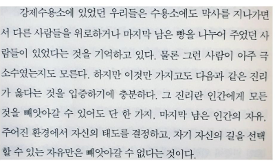 하지만 어떠한 주변 환경에서도 인간의 내적인 선택을 통해 환경에 저항하고 존엄성을 지킬 수 있다는 것도 이 책에서 분명히 이야기 하고 있습니다. 즉, 절망적인 상황에서도 삶의 의미를 찾고 의지를 갈고 닦을 수 있다는 말이죠.