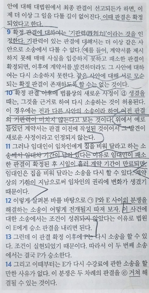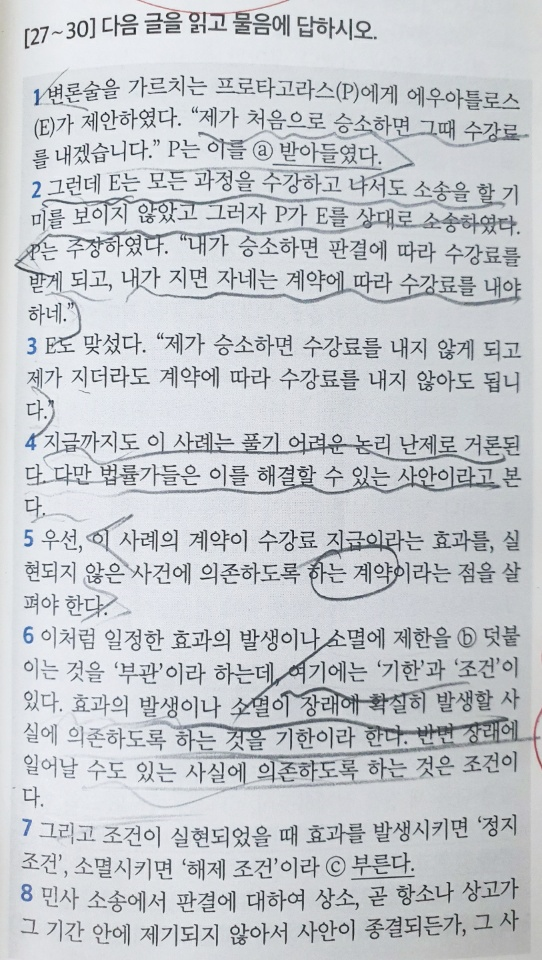 그렇지만 대강 이야기를 해보면 이 지문은 '프로타고라스'와 '에우아틀로스'의 계약에 의한 대립 사건, 그리고 이를 해결하기 위해 기판력과 새로운 조건으로 인한 변화에 대한 인과를 통해 결론을 제시해주는 지문입니다.