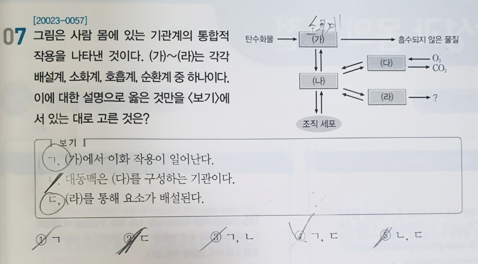 그러므로 보기 ㄱ과 ㄴ은 맞습니다. 마지막으로 ㄷ이 헷갈리실 수도 있는데요! 모든 기관계는 결국 세포를 가지고 있고, 세포는 물질대사를 하기 때문에 모든 기관계에서는 물질대사가 일어나므로 ㄷ도 옳은 선지입니다.