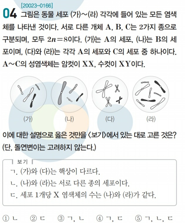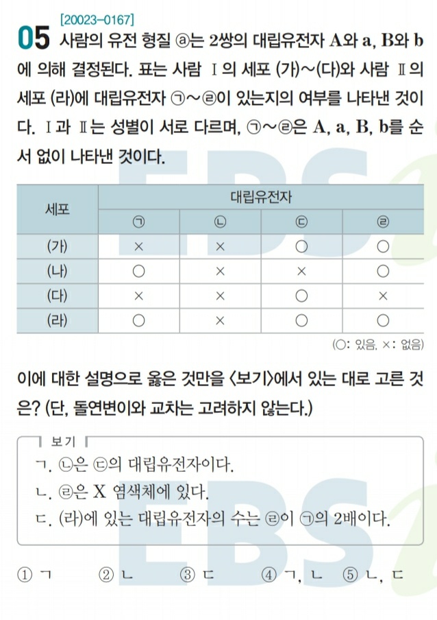 그러므로 ㄴ과 ㄹ이 대립유전자이고 ㄱ과 ㄷ이 대립유전자입니다.(보기 ㄱ은 틀렸음)